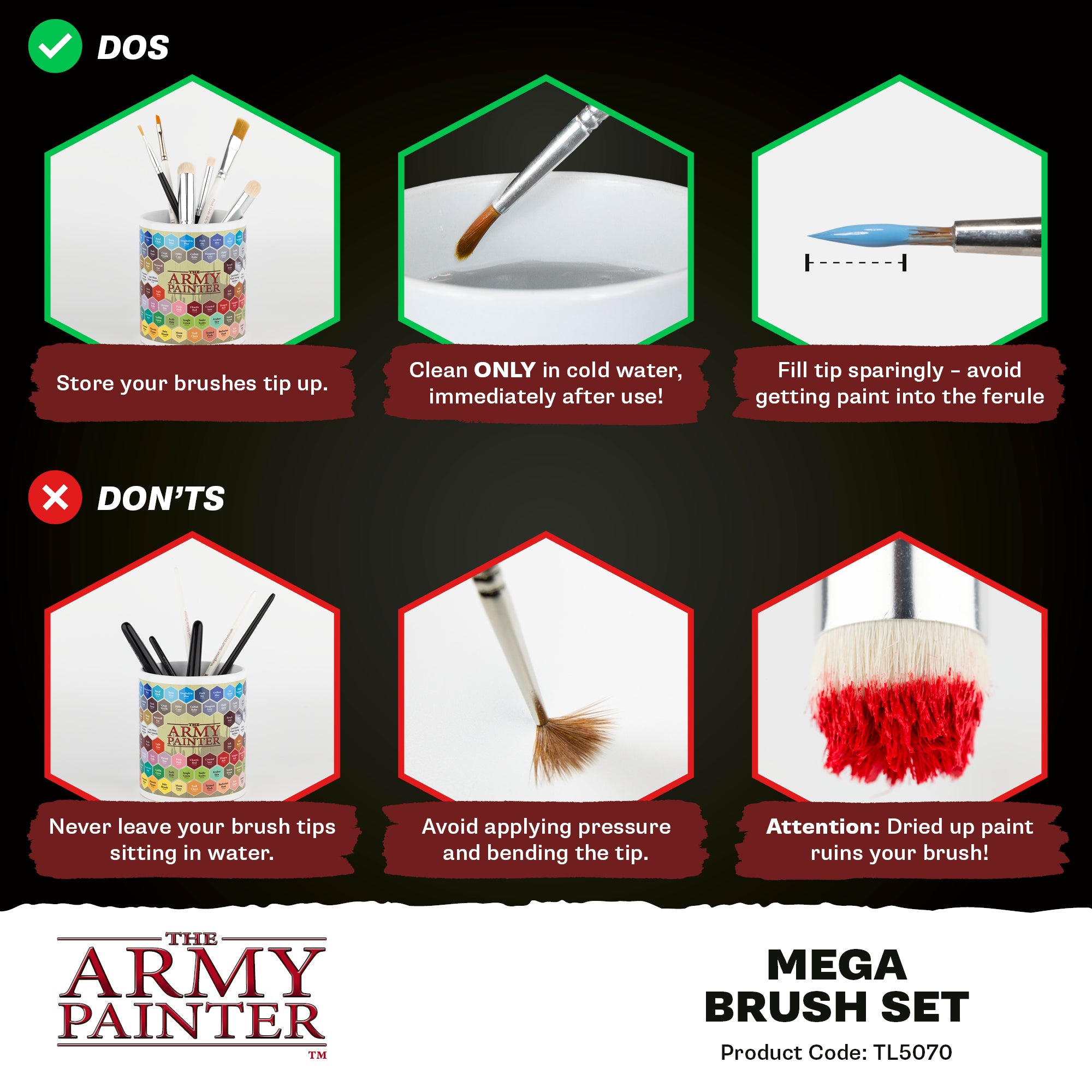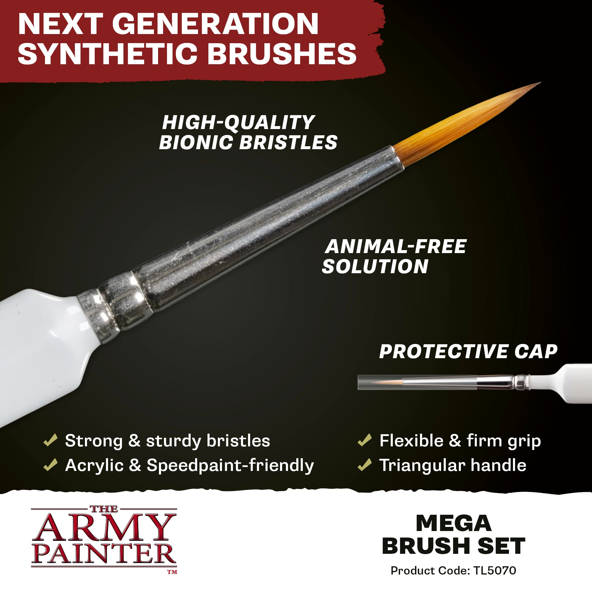 Everything you need to paint anything. The Mega Brush Set brings together The Army Painter's most-used brush types—detail, layering, basecoating, and drybrushing—so you can move from tiny symbols to vehicles and terrain without missing a step. Durable, easy-to-control bristles keep their shape and deliver smooth coverage. Packed in updated, eco-friendly packaging that keeps your tools organized between sessions.